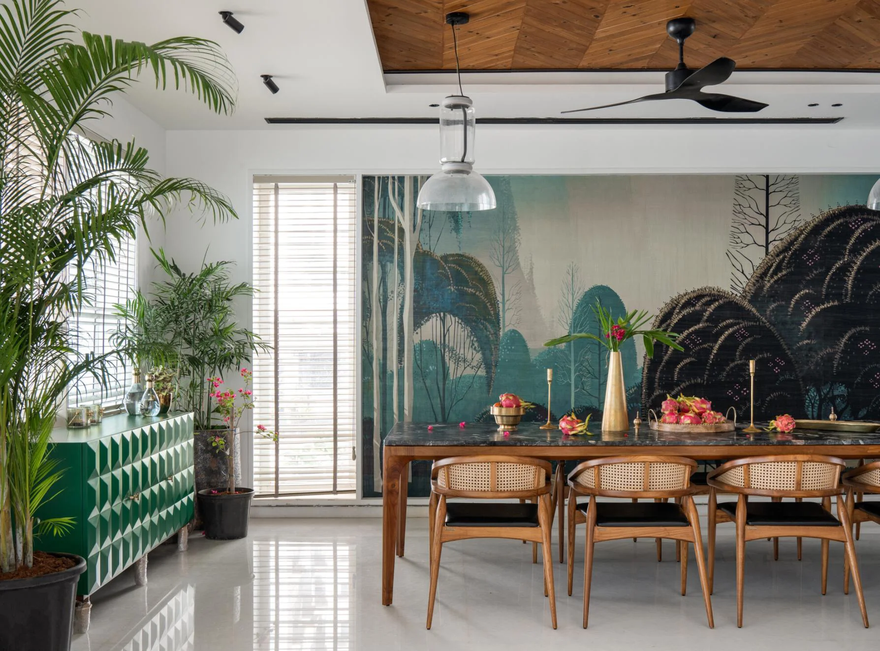 • A subtle metallic geometric design elevates a modern dining area.